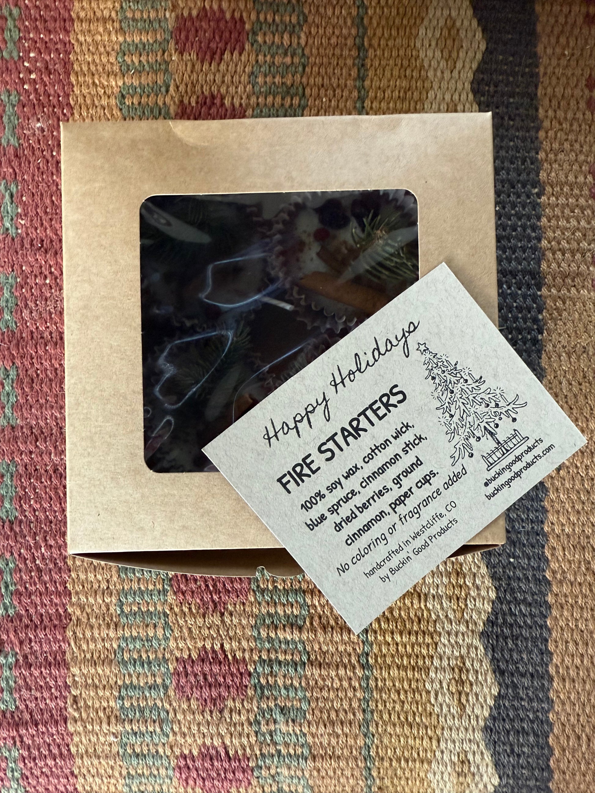 Each fire starter is made of a cotton wick and 100% soy wax in a paper liner with spruce, berries, cinnamon sticks, and dried cinnamon. No fragrance or coloring added.
